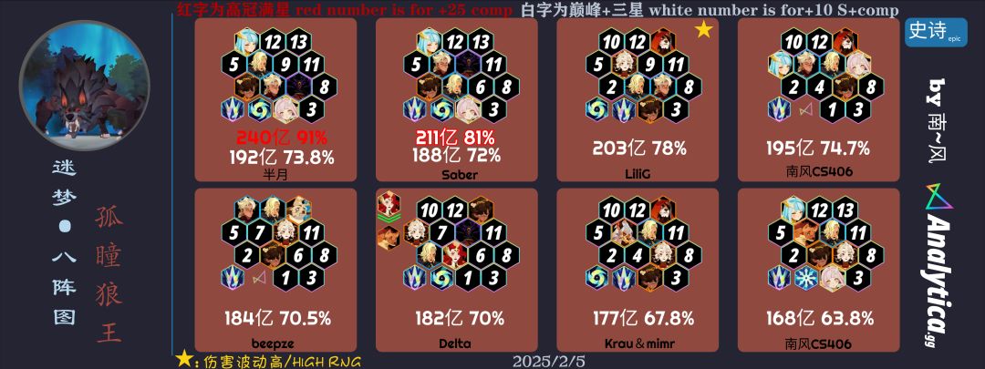 先知少爷更新阵容,700亿比五月多很多,但是站位可能不是最优的,我用其它站位也是差不多700亿次数有限,可以多试一试。试过下曼卡拉或者狼人上五月都比这个阵容差非常多,但是这个阵容站位可能不是最优。4手我没有,不知道他情况。