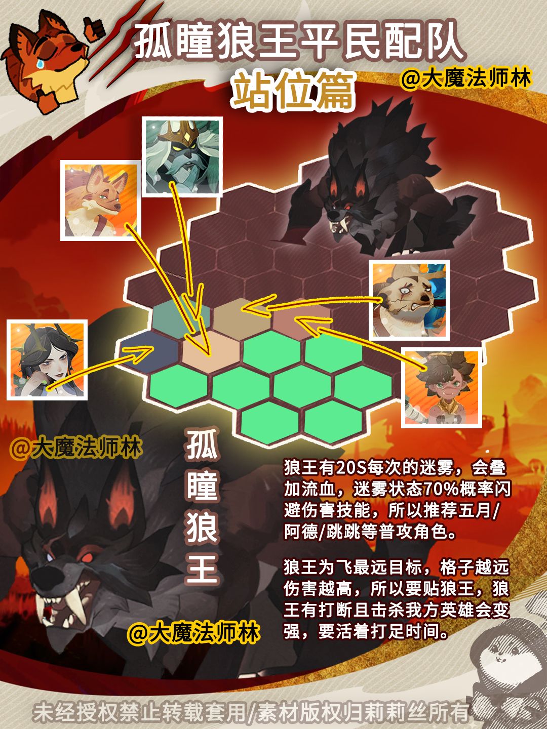 论坛有人问新赛季boss狼王熊王伤害太高,如何活到最后。 其实只要搞懂机制活到最后并不难,但是新赛季才刚开,属性差,5专属卡卡是必须的。 首先是狼王,会对己方最后排释放高伤害技能,即使有卡卡也可能扛不住,这时候可以带老师,老师会召唤弓箭手可以挡狼王的秒杀技能。 要是后排能抗住,就可以不上老师了。 然后是熊王。 先解释下熊王机制。 熊王机制,它近战技能会挂蜂蜜,然后有个点名21秒一次给没挂蜂蜜的挂蜂