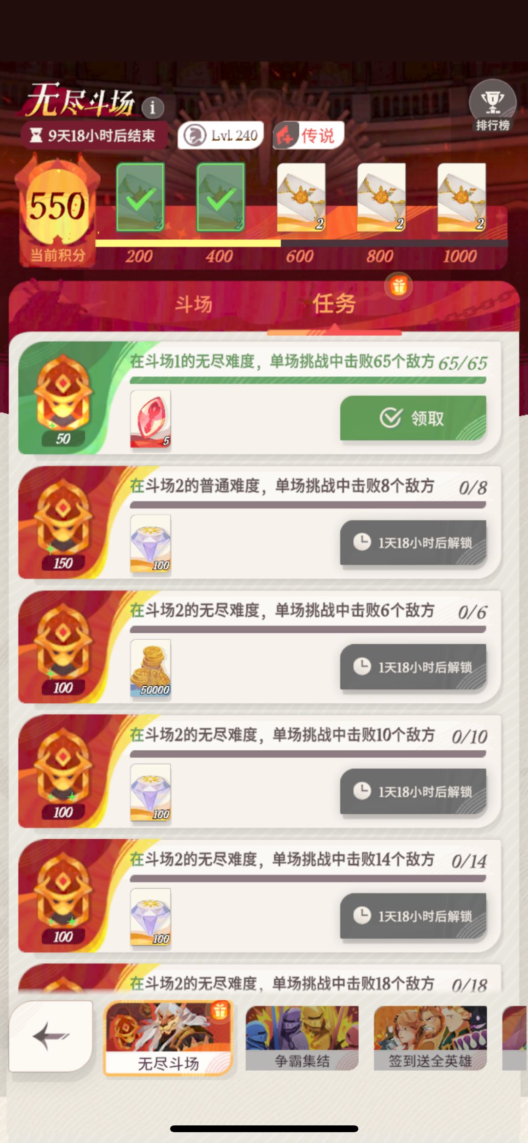 小舞完成了无尽斗场1的无尽模式的所有任务,也就是完成击杀65个无尽模式中的敌人,对于大佬来说还是比较简单的,但是对于小舞来说有些难度,和大家分析一下小舞的阵容。 阵容推荐:首先该模式的敌人是免疫物理伤害的,划重点哦,免疫物理伤害,所以不要上阵物理系英雄啦,好在小舞的英雄基本都是魔法伤害的英雄多一些,尤其是群伤,这里老羊是必须要上的哈,魔法群伤大佬,其次是小五月,超神魔卡不必说啦,蝴蝶有的最好要上