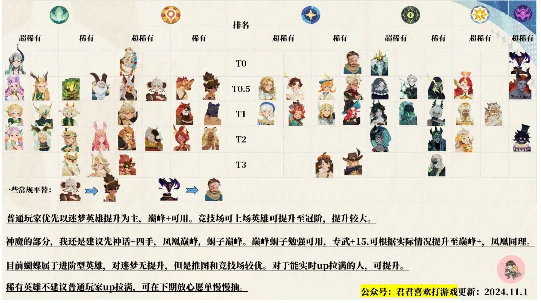 随着版本的变化,以前的很多老攻略心愿单已经不合适了,故我在这结合自己的游戏体验更新一版新手攻略,如下。 这游戏对于低氪来说就是英雄别做错,然后慢慢熬,基本两个月过后区里活人不到200,各种排名前二百很轻松。等进了新赛季的无尽阶段你box差不多成型,这时候就可以享受游戏的PVP乐趣了,总共差不多需要90天。 一、版本强卡以及阶段性目标金卡紫卡我该做什么 目前版本,可以断定能上迷梦或普竞的卡,或者是