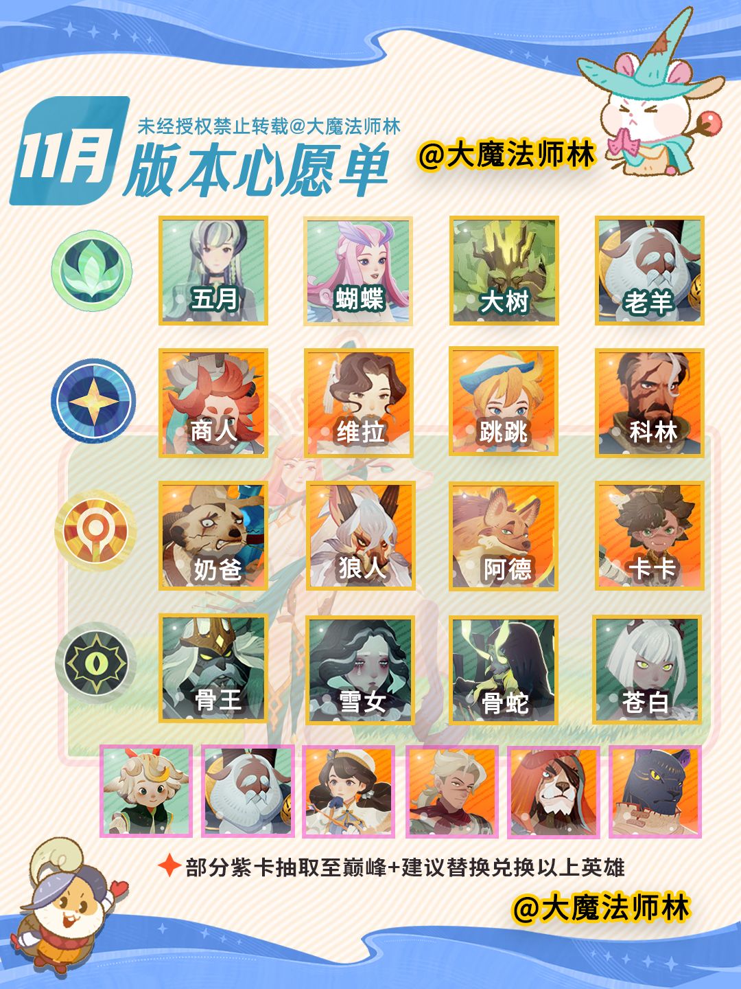 这里分享下个人体验英雄培养心愿单和商店资源的购买攻略! 注明:个人看法,仅供参考 二:心愿单 1.耀光:商人、(女骑或维拉)科林、光弓 2.蛮族:奶爸、阿德、卡卡、狼人 3.绿意:绿箭、老头、小羊、荷叶 4.亡灵:骨王、荆棘、苍白、骨蛇 6.自选心愿单:奶爸、绿箭、骨王、荷叶(维拉或商人) 温馨提示:记得在抽卡抽完30次,解锁心愿单后设置你的心愿单,别手快没设置心愿单抽过头那就血亏了! PS