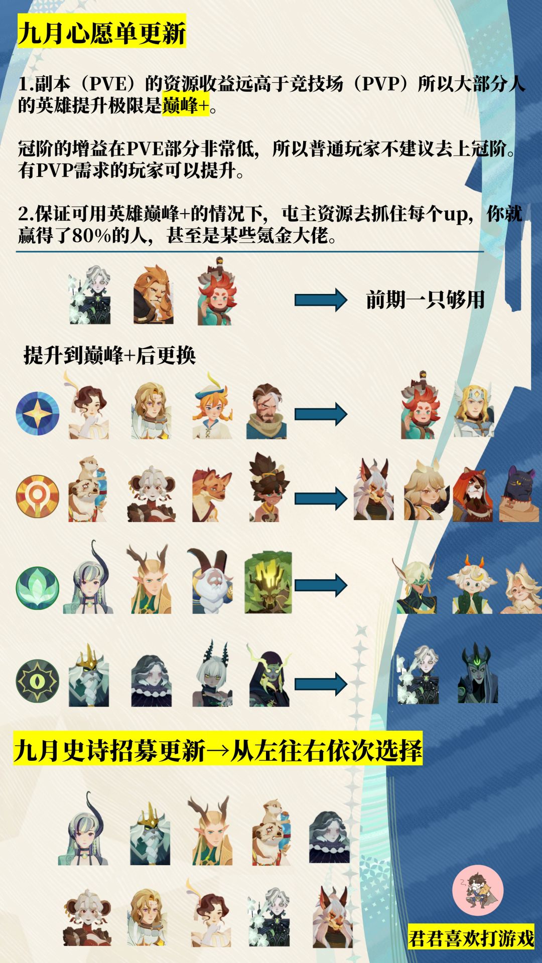 赛季更新的内容基本都已经放出 英雄的强度和就业 经过时间的检验也大都尘埃落定 八宝与大家分享最新的心愿单攻略 对大家都比较关心的启程篇章开荒期 荆棘(零氪#)、商人如何安排练度问题 八宝建议先到神话+开出专武 强度就足够用了 离开红抽心愿单甚至全英雄心愿单 先抽其他无法兑换的英雄 到卡池有一定练度 需要规划冠阶的时候 在商店兑换本体 或者重新放回全英雄心愿单即可 #定档测试创作征集 #剑与远征启程