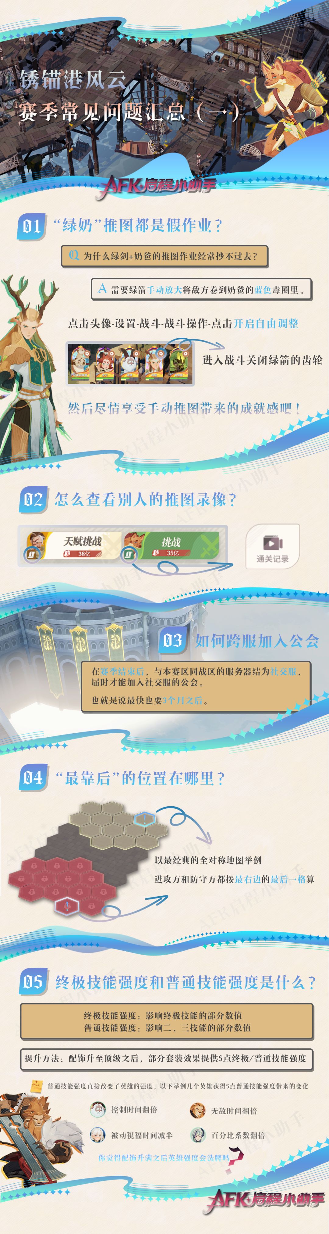 大家好,这里是小编阿德。 新赛季锈锚港风云基本快进入长草期了,跟大家分享一些自己的游戏理解和部分的游戏讯息,如果有引用会标明来源,如果有误,请大家在私信指正。 一、常见问题请直接看图一,后续会继续更新如果有其他的问题欢迎留言提问,问的多的会继续汇总制作一图流进行解答。 二、图二是是目前理论上伤害最高的阵容,此阵容需要RE几次保证凤凰不死才能出分,如果阿德打不出伤害可以换五月。 PS:由于每