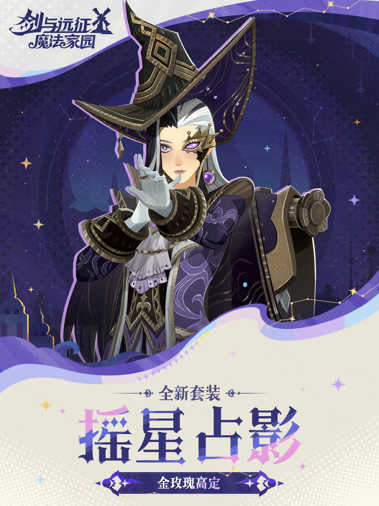 高顶帽身雕刻着立体星轨纹路,与领口垂落的蕾丝褶皱相映成趣。镶嵌着紫水晶的胸针,在光影流转间折射出细碎的星芒。单片眼镜的金色星芒边框,与紫色妆容完美呼应,举手投足间,仿佛下一秒便能拨动星盘,窥见命运的轨迹。星盘启命,玄光引途——全新时装「摇星占影」即将上线!◆ 获取方式 ◆金玫瑰高定商店获取。*具体上线时间和皮肤效果请以游戏内为准#剑与远征启程 #光影迷局 #魔法家园 #afk2光影迷局