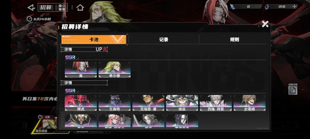 70%概率出up的80小保底160大保底(无概率递增)+1.5%SSR概率+双up池 重复获得相同角色时,会自动转化成对应角色的圆盘 SSR: 60个 SR: 20个 R:10个 N: 10个 每天基地可给三个不同角色跑片(第三槽位需25级),每次跑片给4片,满命需360片,即需要跑90天。 #游戏种草计划 #浅评一下 #发现好游戏 #今天游戏圈发生了啥 #晴空之下 #游戏安利 #游戏日常 #游戏