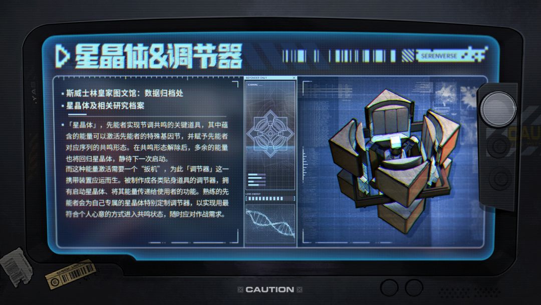 星晶体&调节器 ✦斯威士林皇家图文馆:数据归档处 ✦星晶体及相关研究档案 「星晶体」,先能者实现节调共鸣的关键道具,其中蕴含的能量可以激活先能者的特殊基因节,并赋予先能者对应序列的共鸣形态。在共鸣形态解除后,多余的能量也将回归星晶体,静待下一次启动。 而这种能量激活需要一个“扳机”,为此「调节器」这一携带装置应运而生。被制作成各类贴身道具的调节器,拥有启动星晶体、将其能量传递给使用者的功能。熟练的