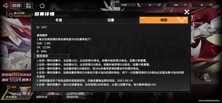 1. 计算一个SSR的期望抽数不考虑软保底的情况:基础SSR概率为1.5%,期望抽数为:1/0.015=66.67抽但因为有80抽硬保底,实际期望会略低。考虑软保底的情况:分段计算:1. 前50抽:每次1.5%概率。2. 从第51抽开始,递增0.5%概率,直到第80抽强制保底。通过模拟或递推计算,SSR的期望抽数约为62.5抽。--- 2. 计算一个UP SSR的期望抽数:这