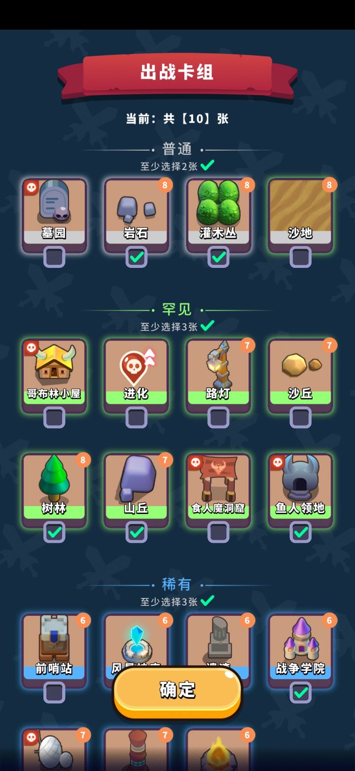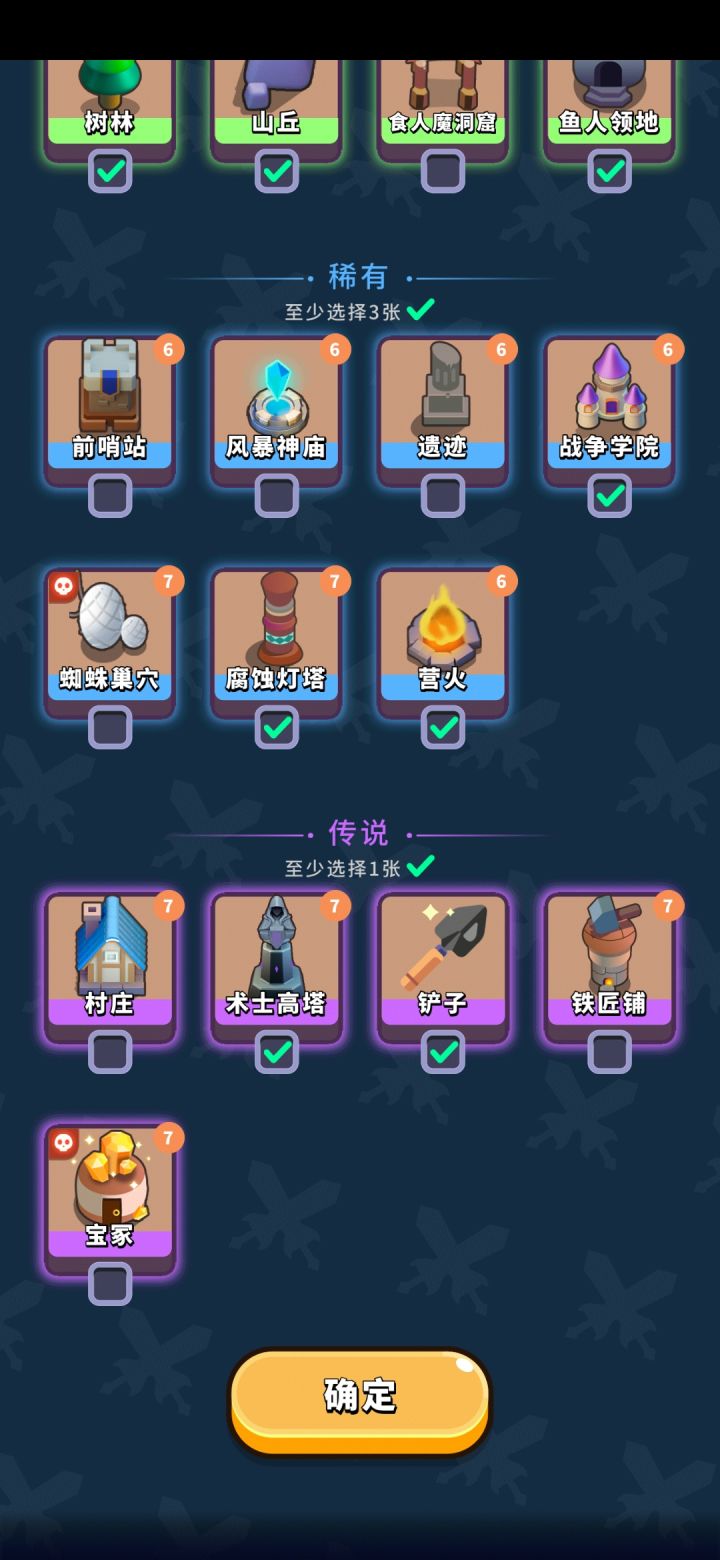 开局点这些岩石 灌木前两层凑数用 叠属性的话后面基本忽略这两个山丘 树林到三层之后只用这两个合 物品栏有岩石灌木也可以直接忽略 个人建议多合四个山丘 鱼人领地+术士高塔+ 战争学院这三个建筑配合摆放 加上升级获得的技能不断叠属性 战争学院加经验效果可以重叠 一个鱼人领地旁边放两个术士高塔会刷两术士加两鱼人腐蚀高塔 战斗开始扣除怪物百分比血量 可以叠加 前面没用 如果叠属性叠烦了也懒得摆建筑了 到高层数可以多摆点 怪物血厚打得快