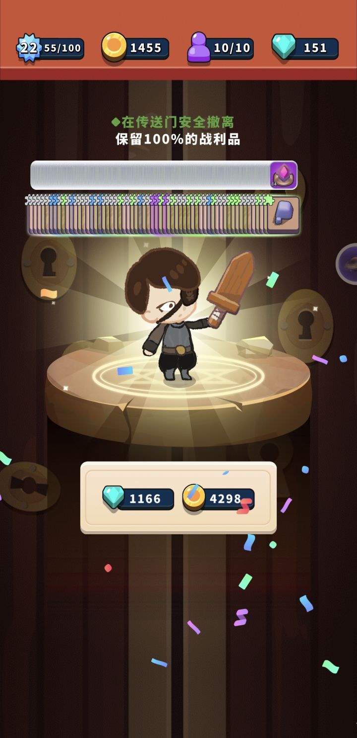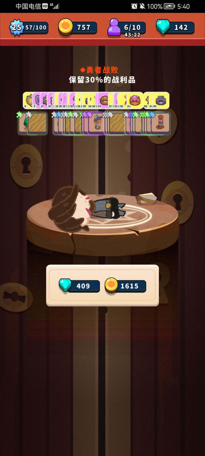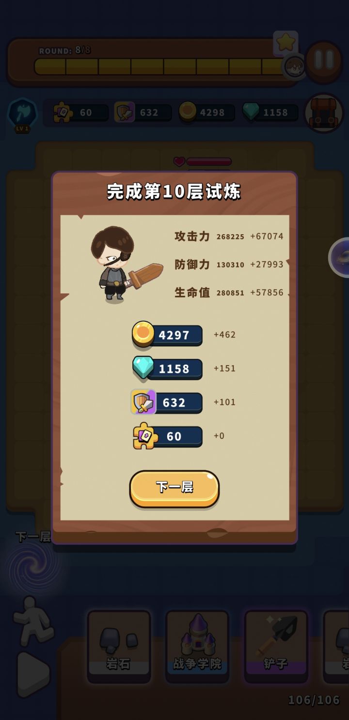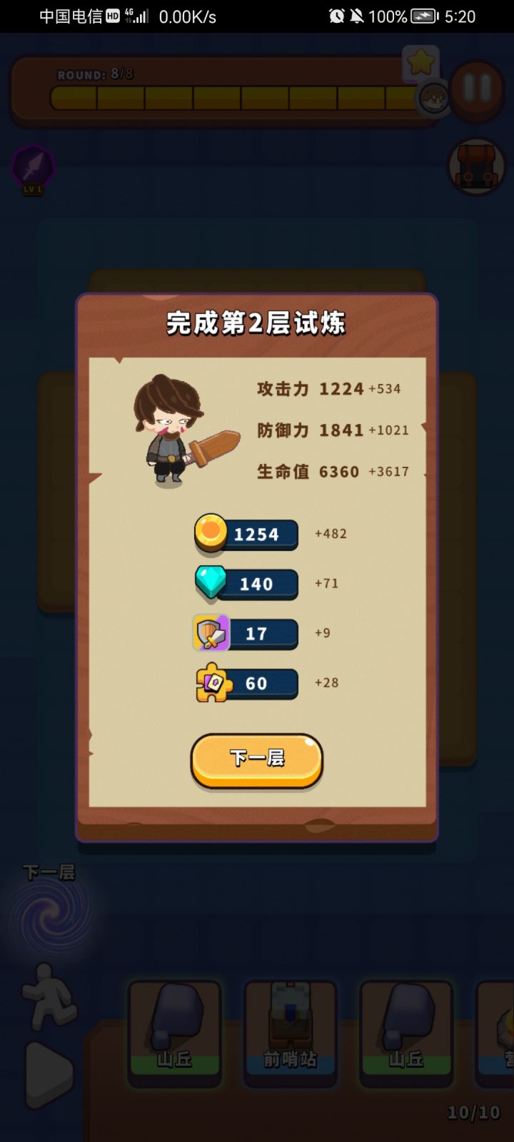 坚持打完了第⑩层,刷怪快刷吐🤮了。主要是卡的。这里希望开发能优化一下。建议每一圈能跳过战斗过程,可选一圈以后再出这一圈的结算报告。毕竟,反正点了开始,这一圈就定了输赢,没法中途挽救!完全可以忽略战斗动画,只提示战斗结果、挑选战斗爆装!我这一把就是一天啊,实在不想割草,无奈点了撤退,其实10层的Boss打我无伤,还可以继续刷的