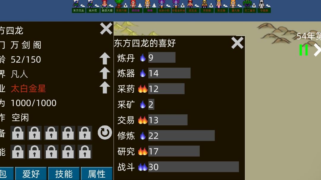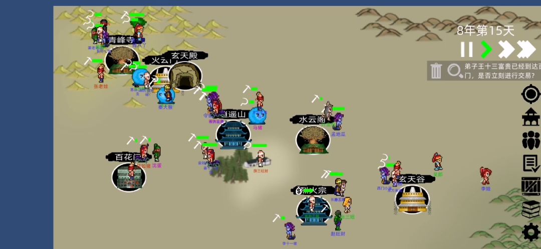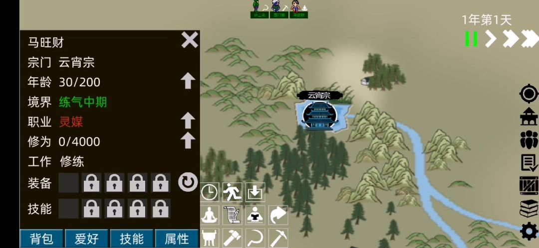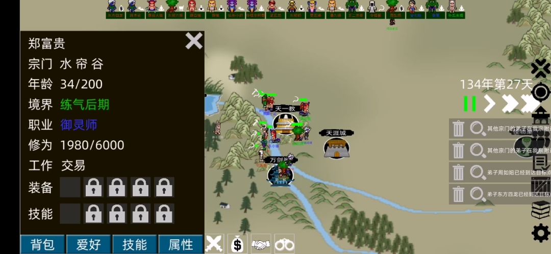 新手教程(你参考下,不足和简化你自己补) 个人站在玩家角度: 宗门建立后 ❶先教时间停滞【安排完再流动,新人玩家这样可少浪费里面很多的年/天数】 ❷之后,是职业怎么解锁介绍。(减少浪费解锁时间) ❸接着,工作安排介绍。(先安排事)【让玩家把不想战斗的弟子,战斗🈚安排,要战斗的安排上。】该修炼专心修炼吧 ❹再介绍,每个弟子个人指令。 ❺吃寿命丹药(自己或其它宗门炼丹炼出/仙人携带可能) ❻吃经验内丹