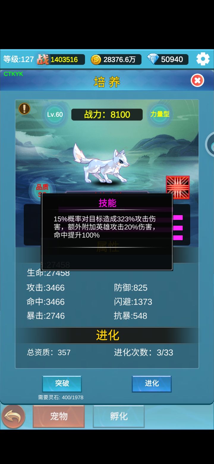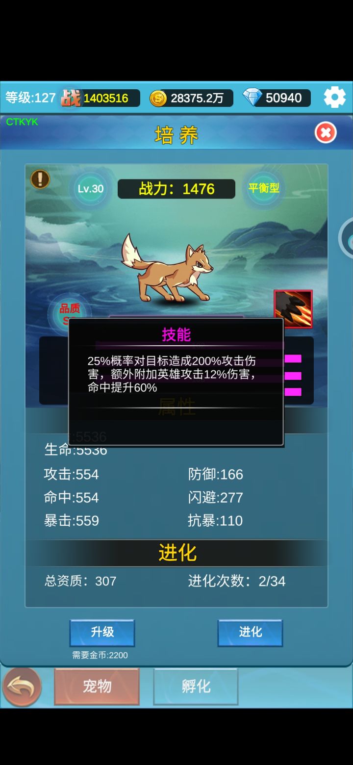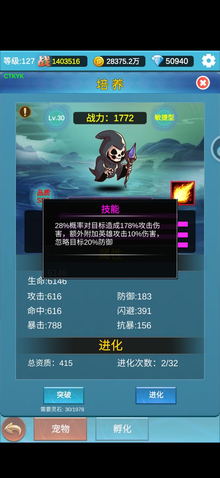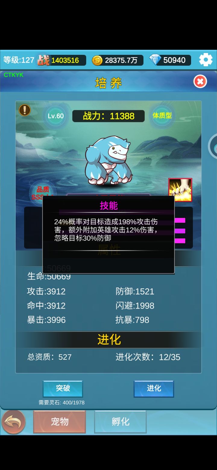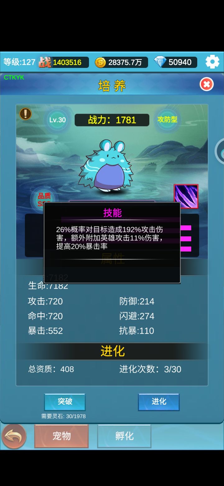 本次更新新出了宠物系统,一共有七个类型,最重要的是每个类型都有一个特殊的技能,具体类型可以看下面的图。能直接孵化出来的宠物资质是SS(300-399)-S(200-299)-A(150-199)-B(100-149)-C(?-99)-D(?),其中D级啥用都没有可以直接放生,所以没特别关注资质的上下限😂,其余的都可以作为进化的狗粮,而A级以上就可以进化。而进化之后就是SSS(400-499),S