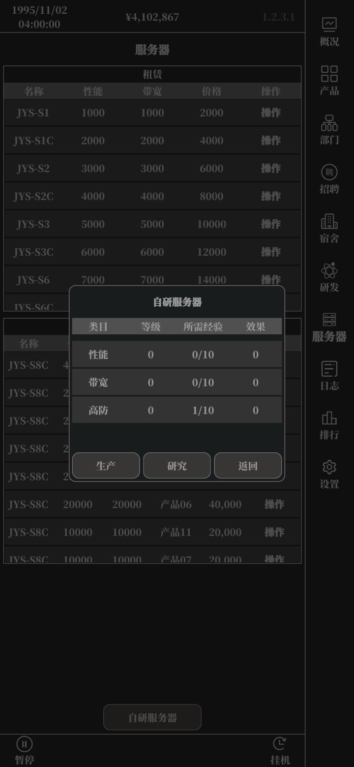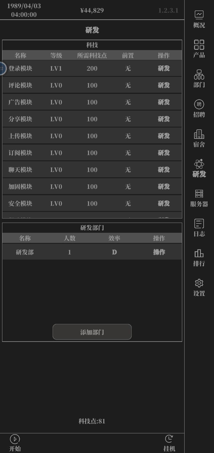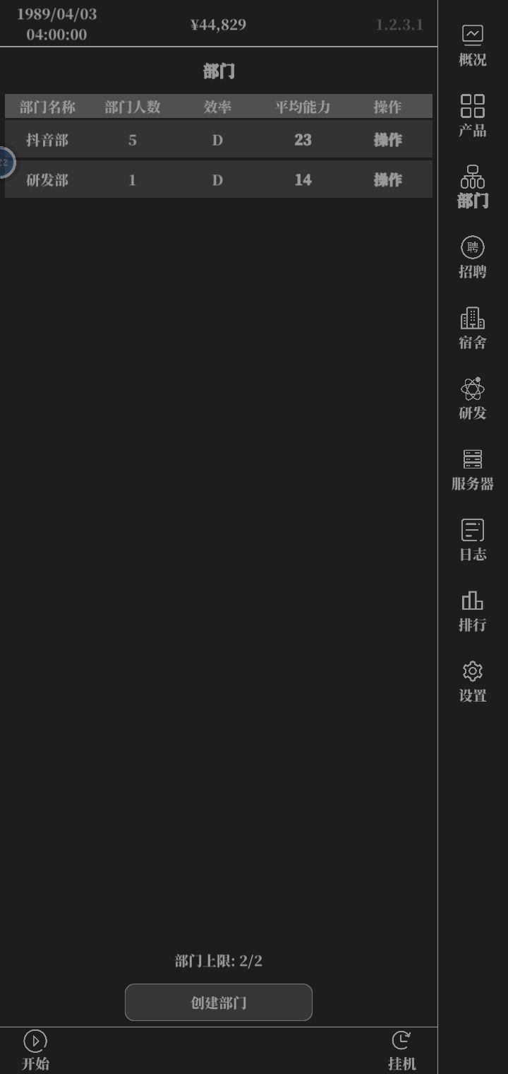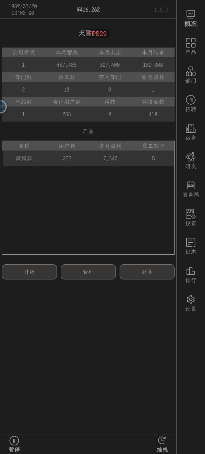 以下为概括界面内容介绍1.公司等级_当前版本最高公司等级定格在60,每次升级的所需资金逐步递增2.本月营收_该方面是根据产品的用户数量以及部门效率决定3.本月支出_字面意思,记录本月所有支出4.本月结余_字面意思,营收-支出5.部门数_最大部门数为公司等级×2即每级增加俩个可创建部门6.员工数_在未升级科技-人员上限之前每个部门最大为十人7.空闲部门_字面意思8.服务器数_字面意思