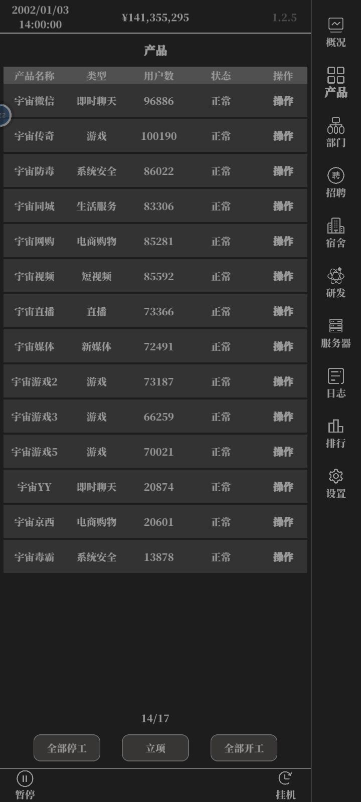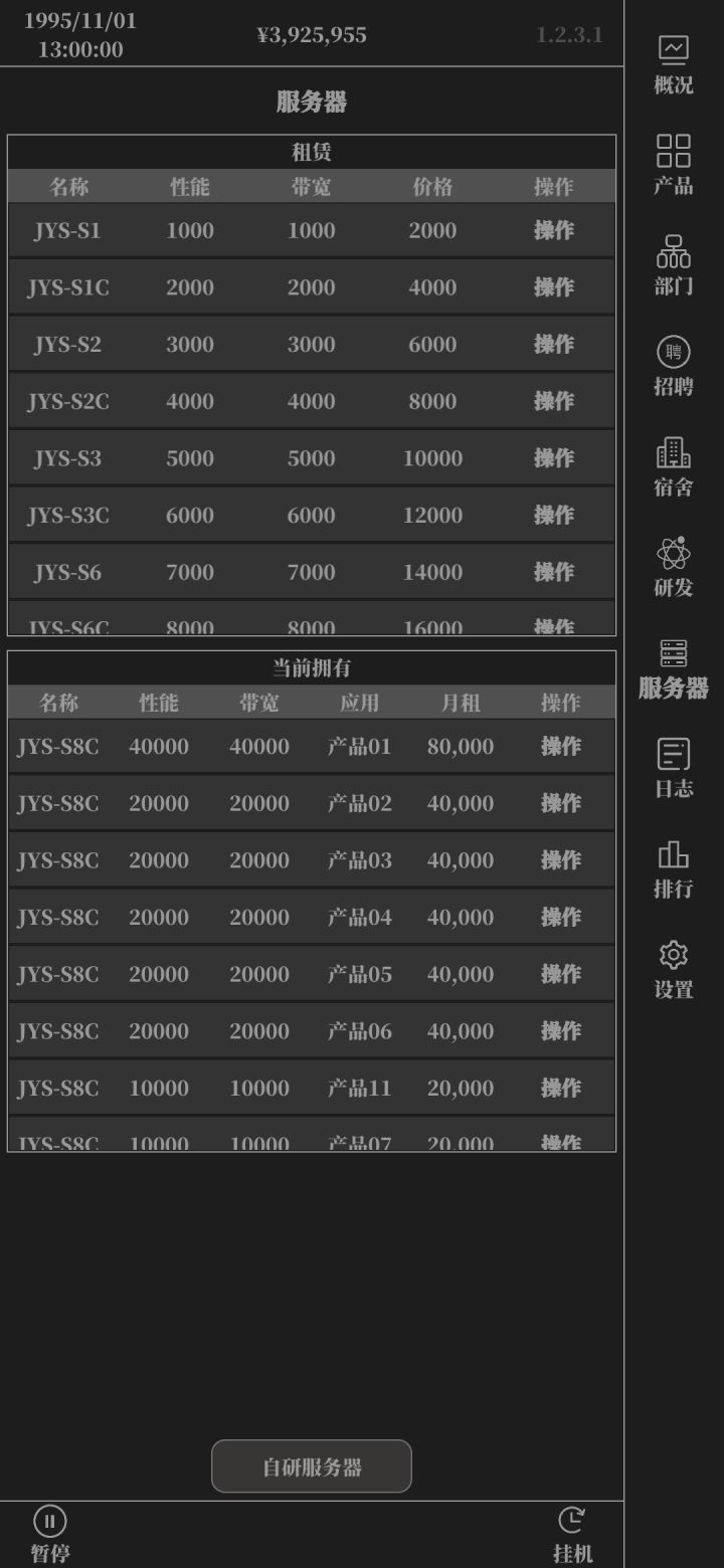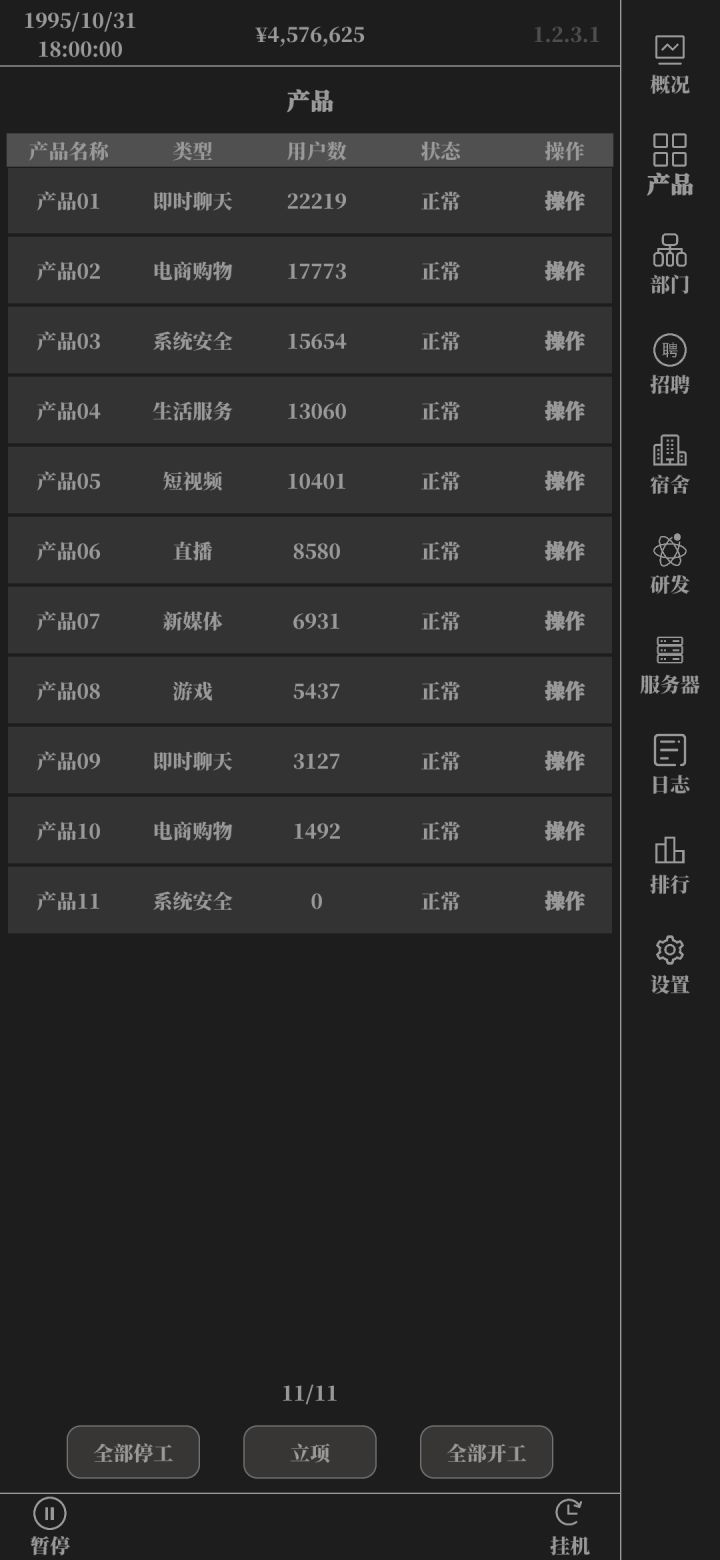 以下为概括界面内容介绍1.公司等级_当前版本最高公司等级定格在60,每次升级的所需资金逐步递增2.本月营收_该方面是根据产品的用户数量以及部门效率决定3.本月支出_字面意思,记录本月所有支出4.本月结余_字面意思,营收-支出5.部门数_最大部门数为公司等级×2即每级增加俩个可创建部门6.员工数_在未升级科技-人员上限之前每个部门最大为十人7.空闲部门_字面意思8.服务器数_字面意思