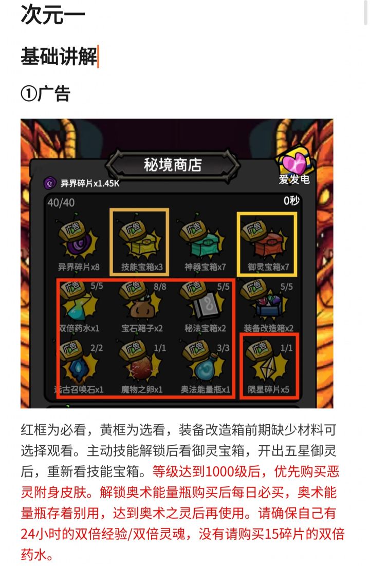 新手开局建议玩技能流(当前版本)开局呢视频全看技能宝箱,除了天星地爆 天雷术 火球雨 灵场,其他技能碎片全部分解换技能宝箱。包括魔法弹也分解(分解后在商店右上角兑换)开局精血全部点智力,神圣不着急点,力量跟技能流没关系,血量就是摆设。大概10000点精血的时候就可以给神圣点500,70闪避真的很舒服龙塔1000关之前给的东西特别多 1000-10000就变少了 往后会没有奖励刚开局装备尽