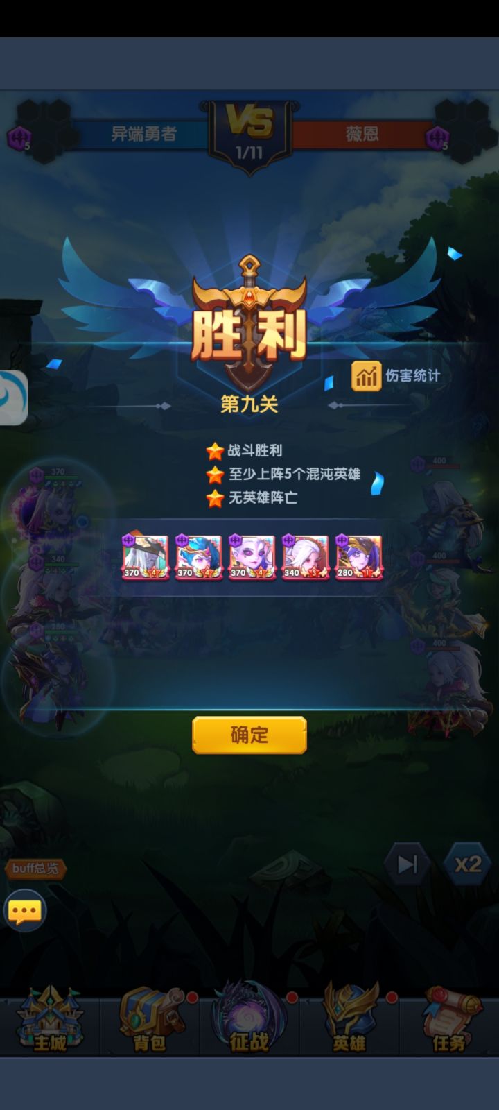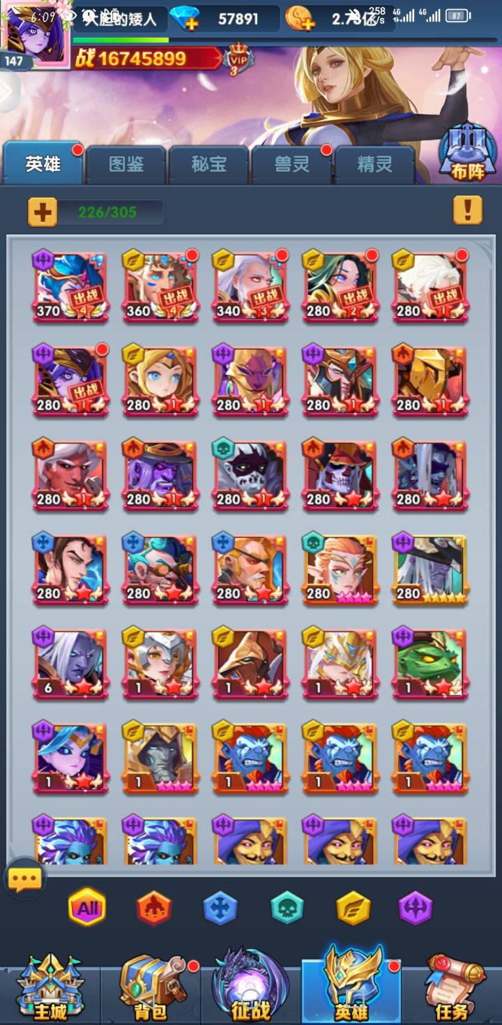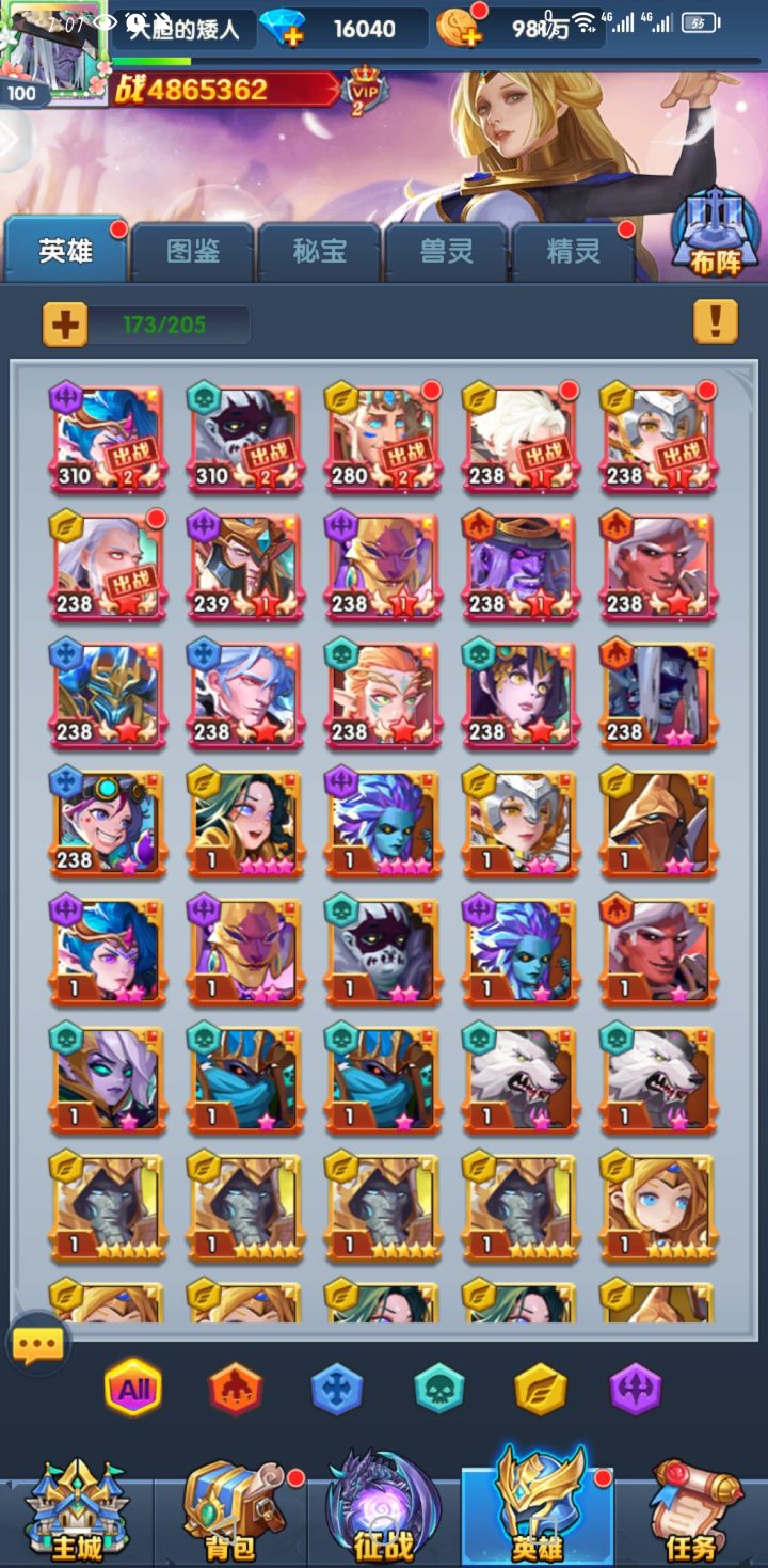 然后就是英雄培养,开局火女会免费送两张,是最容易升到9星的,优先火女9星,抽到两张奥利给把火女重置,所有资源灌给奥利给,剩下的资源灌给男爵,上面四张光暗抽到哪张就培养哪套阵容