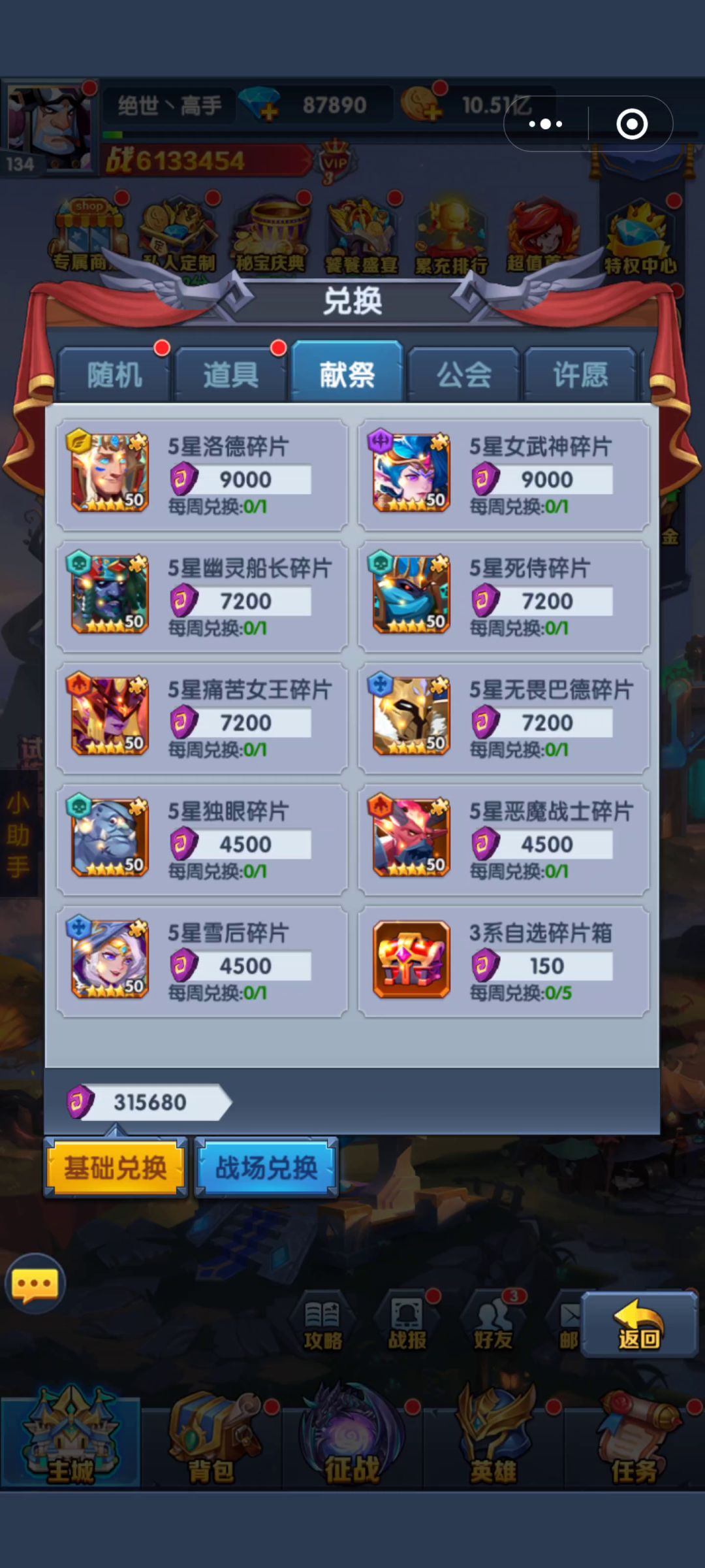 这个方法适合在刚好差一个女武神,又等不了一个星期的情况下用,材料是献祭没用的英雄得。 换满商店全部东西就会刷新了