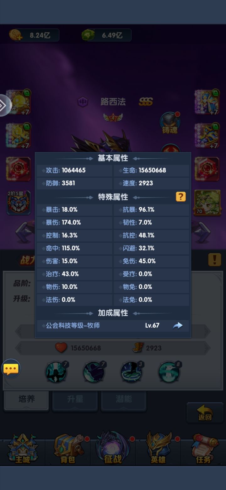 路西法几乎是主力队伍必备的。对于PVP,pve两种玩法的倾向性不同,路西法的练度也倾向不同。主PVP的,路西法可以尽量练度高,路西法练度高可以当盾,当奶。高练度路西法,铸魂洗免死,放前排可以抗很多输出,只要对面打不死路西法,主力就能躲在后排输出,配合路西法的被动回血,血量很容易就回满血。可以参考阵容:第一排路西法,第二排莱奥或米老头,第三排艾丽西亚,哈迪斯,女武神。主pve的,路西法稍微练一