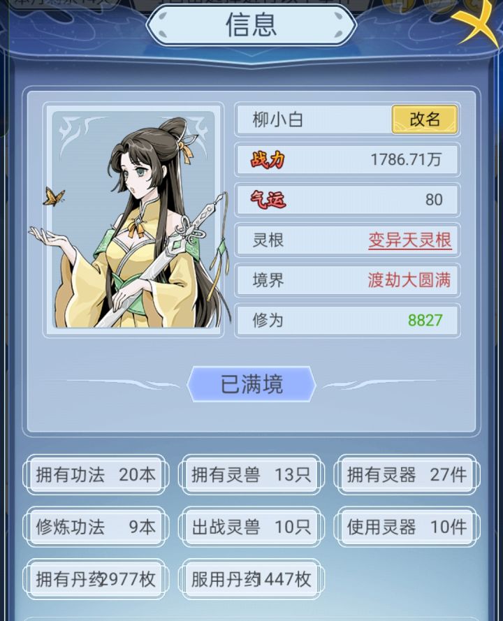 在全面而均衡的发展之下,终于在134年达到了巅峰,包括以下方面,遂求一个对手。①修为渡劫大圆满,战力3700万;②功法12帝级极品,6帝级上品,均9层满;③灵兽10只全部帝级极品圆满,且金木水火土各2只,10只不重复;④灵器10把,帝级极品圆满;⑤宝物全部3阶满;⑥神器全爆,除10阶核之外全满;(需要用低级核升级的也没落下)⑦结拜一大堆,好几个999交情,柳惜月已经