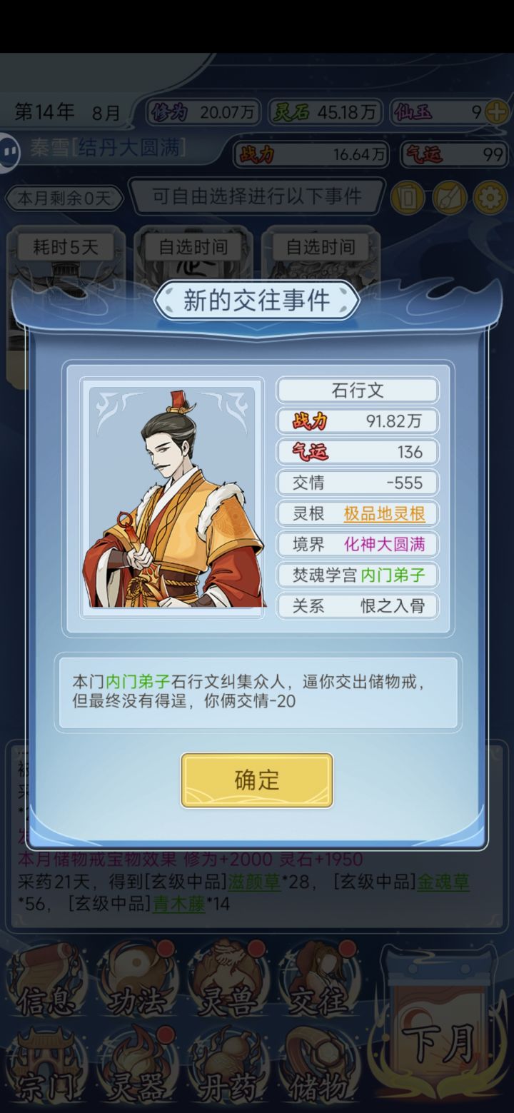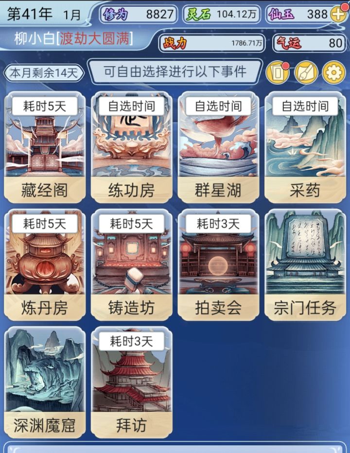 1修为:通过修练升级,点就完了。前期突破机率大于70我就直接突破了。等到50%以下就可以开始采药练丹,够吃到100%就可以又点修练升级2:灵兽,武器,功法都只加战力没有加修为,一般可以不用点3:宗门,宗门前期有点就点一下,后面点不到的,因为提供的贡献不高,我一直有点任务,修为都渡劫了,贡献只能到外门护法,所以可以考虑不点。