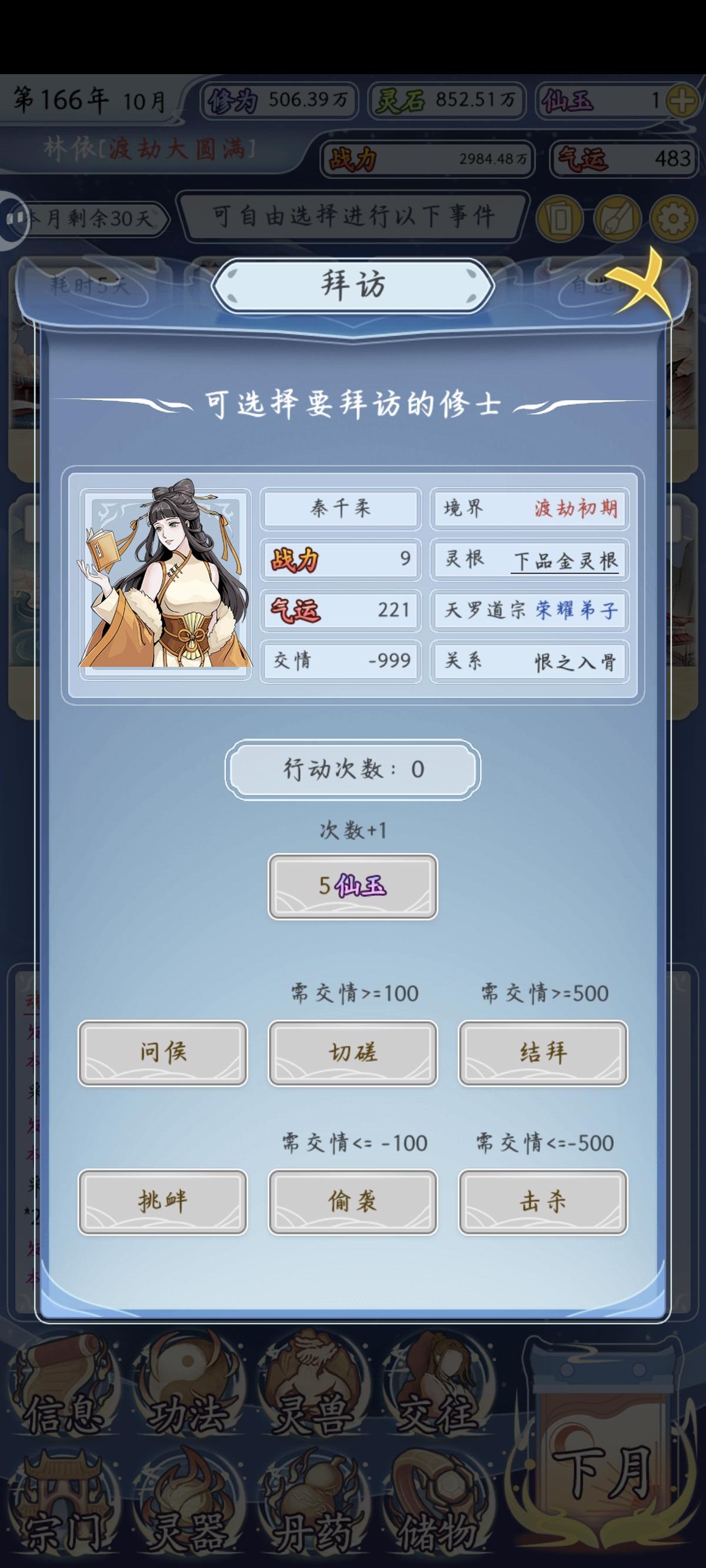 前期:狂刷练功房,刷完一个月就跳到下一个月,修为到了就直接突破,不要想着当个小天才,去刷战力中期:一边刷练功房,一边练丹,把突破概率刷上去直接突破,跟前期一样,也没有必要刷功法武器什么的 后期:现在已经不用刷练功房了,练丹就可以了,修为磕丹药自然就上去了。要提升战力的话,拉三个工具人一起去游历,灵兽仙玉什么的自然就有了,有了仙玉就到拍卖会买买买 ,注:职位很重要,这是获得灵石的唯二方式,但在
