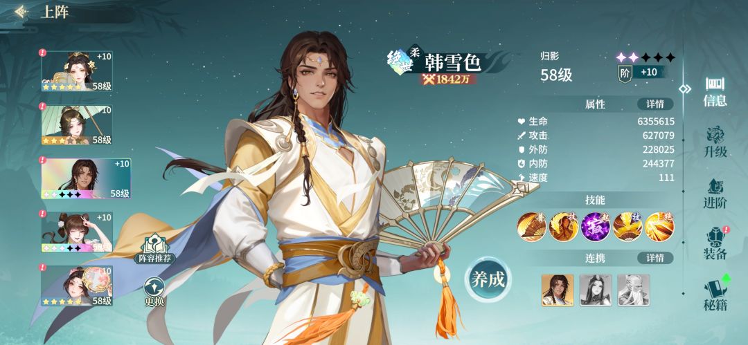 #江湖如梦 区服w63 角色名:青玉恋 区服w92 角色名:毒影现天蛛 区服w92 角色名: 刚猛雷化龙 大家好久不见,最近忙于新区科研新阵容,第一天开区的服务器过于内卷已经无暇顾及。这里为新手豹子头们带来了三套不卡关主线又可以稳定达成沉沙谷和云上楼的发育阵容。希望能够启发思路,继续探索未知的江湖。 第一套阵容是我一直坚持的老头队,推荐角色韩雪色,独孤寂,上官妙语,魏无音,黄缨。这套阵容的核心坦克