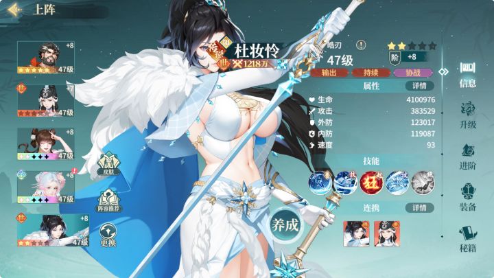 建队如图,典型的专切后排菜刀队。我自己是用鱼肚聂开荒的,这个队伍的特点在于:非常省钱。非常有竞争力。长达一年时间,只买月卡和战令。在战力1500E之前,用这个队伍,与薄队,火队,追,鬼,毒均可一拼。看谁攻击强,最终增伤高来决胜负。器魂首发离垢。阵必须是雷。鱼肚队的第一核心在杜,开了溅射,一刀一个小朋友。其实不用考虑被针对,很多对手把肉盾放后排,但是杜专武效果同样灭队。关键还是收菜,提升练
