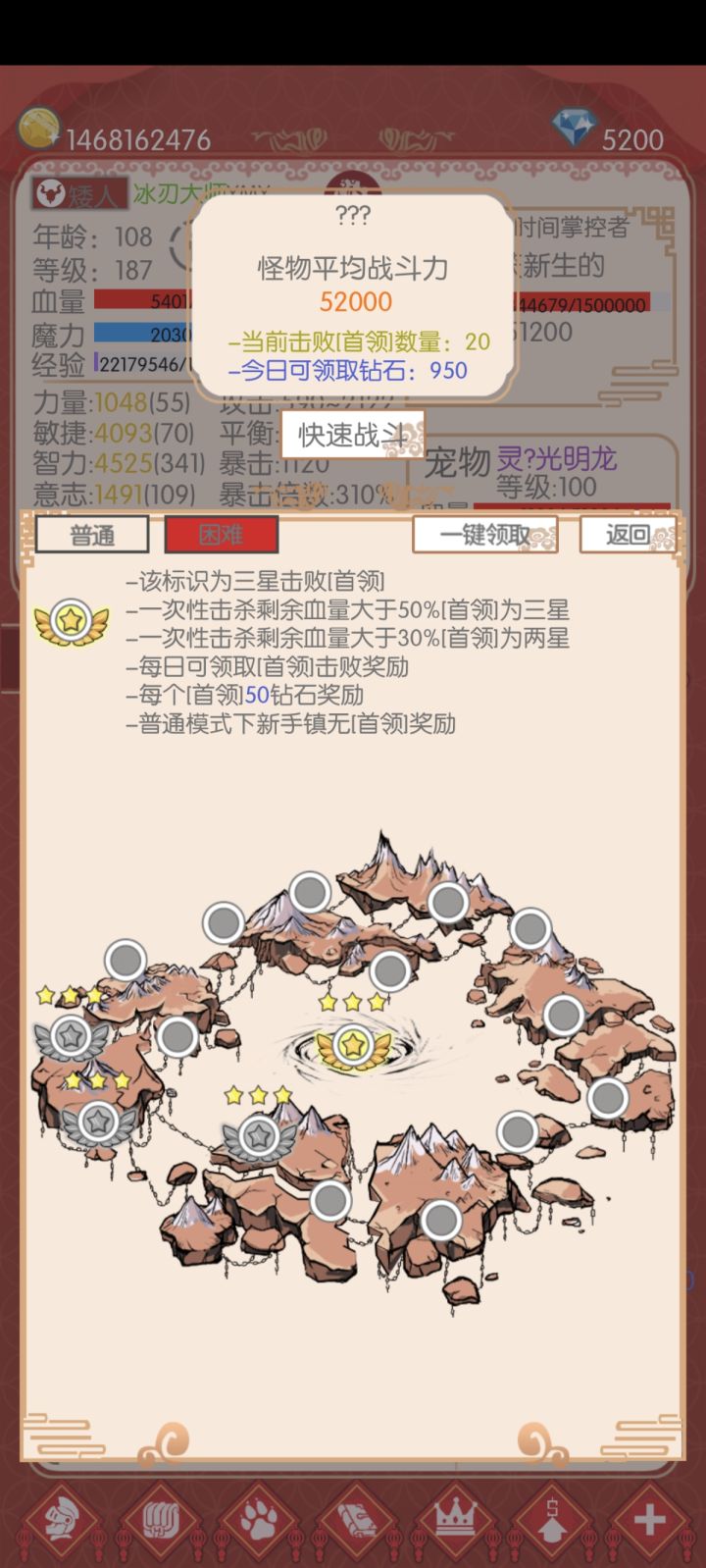 前期就是肝,冰刃,前期魔法宠物宠物资质有个4左右完全够用,但是宠物必带两个技能回蓝和火球,回蓝必须是进阶冥思,等级必须80级以上才能够冰刃无限冰,普通最后关卡基本三星就没问题,困难就随便打了,能过三星普通,困难三星就能过,我就是直接打完普通三星就直接打困难三星