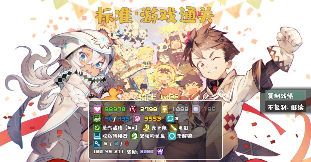 游戏种子:[30123216] 初始奖励等级:15 骑士 ----区域2--- 00:13:47 血量:6571/攻击:53 防御:69/魔防:60 金币:797/等级:10 装备:小刀/未解锁/未解锁 未解锁/未解锁/未解锁 钥匙:10/0/0 ----区域3--- 00:42:27 血量:40089/攻击:166 防御:255/魔防:74 金币:1939/等级:18 装备:蒸汽戒指【Ex】/光