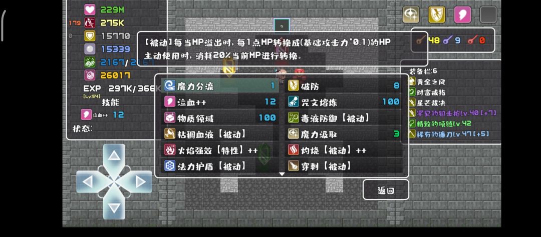 技能描述,每溢出的一点魔力回复攻击力X0.1的HP,配合法力源泉(恢复1%MP),在两千多点MP后,全程泣血,打扣血少于当前攻击力的怪,虽然显然扣血,但还是在加血的,当3200点HP之后,打扣血少于攻击力一倍的怪也不会扣血,4200点是三倍,以此类推