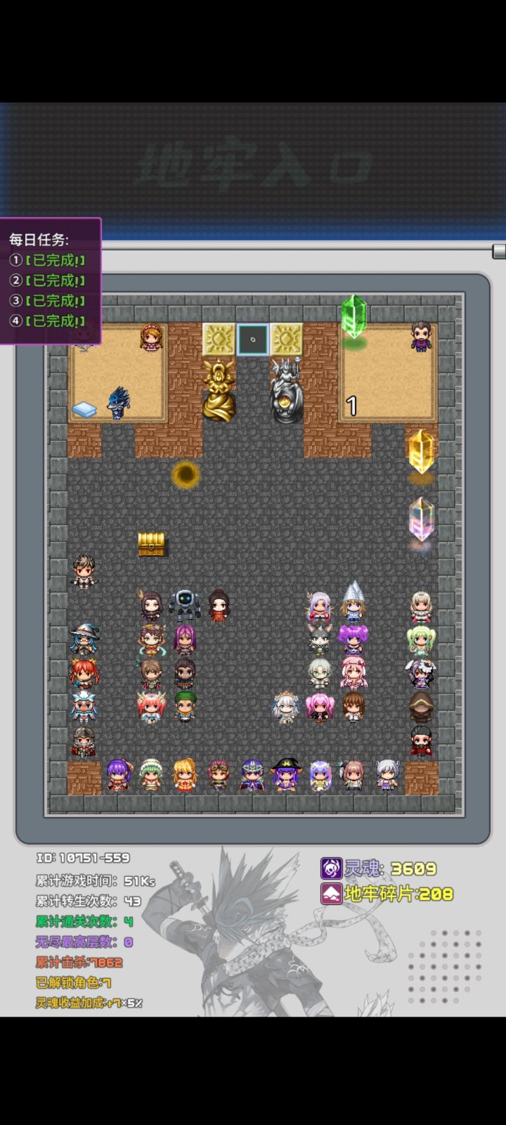 下载,打开软件(废话)输入兑换码000001(右上角绿水晶,或者进入游戏后点人物面板)开启难度加成。先买技能树,先买技能树,先买技能树当然开始不够,忍着,别买属性加成先买技能树,先买技能树,先买技能树!第一阶段:坐大牢先坐牢,难度开 更多墙壁,不满的血瓶,不满的蓝条,165%加成,升一级给你102魂。初始角色剑士,直接进,随便打,升级后差不多了直接转生,快速坐牢,凑15000魂,开技能