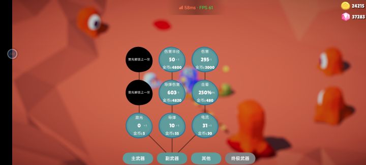 最开始几把结束后可以先弄 其他 里面的金矿机器人和数量,机器人速度要点,挖金币速度嗷嗷的。第二天可以搞副武器的电流。先点伤害,个数30个左右就差不多了,然后点击晕。第三天开始搞副武器的导弹,个数建议6-8个,多了卡。这个时候开始主点伤害,范围加到50就可以了。导弹搞到后期就跟原子弹差不多,怪出来就秒。轻轻松松就到六天,宝石差不多可以打到五万。