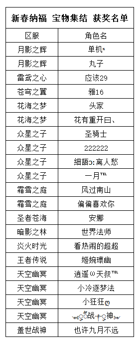 《世界OL》新春纳福 宝物集结 获奖名单