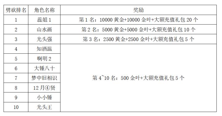 注:以上活动排名均以服务器时间为准。新区排行榜活动如发现存在违反游戏相关规定使用游戏外的辅助工具进行作弊将取消获奖资格。恭喜以上获奖玩家,奖励将于7个工作日内发放,如有疑问请及时联系客服~