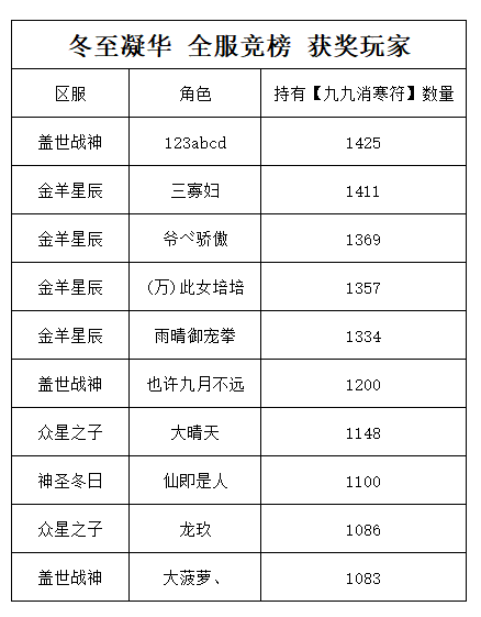 《世界OL》冬至凝华 全服竞榜 获奖玩家