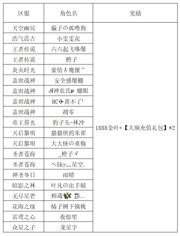 注:以上活动排名均以服务器时间为准。新区排行榜活动如发现存在违反游戏相关规定使用游戏外的辅助工具进行作弊将取消获奖资格。恭喜以上获奖玩家,奖励将于7个工作日内发放,如有疑问请及时联系客服~