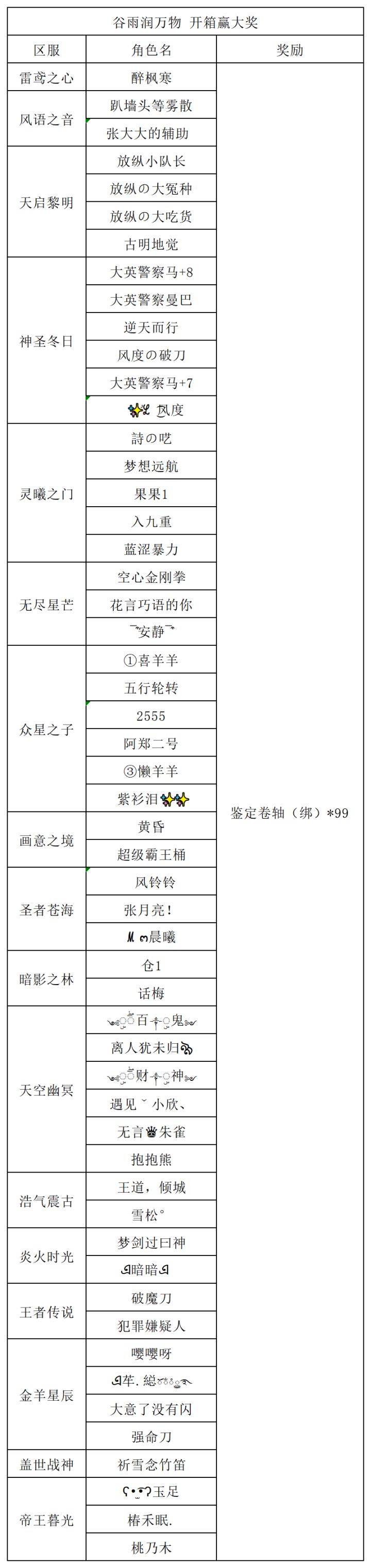 恭喜以下获奖玩家,奖励将于7个工作日内发放,如有疑问请及时联系客服~玩家可自行将相关道具进行清理。