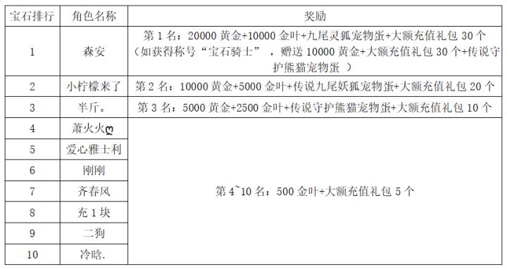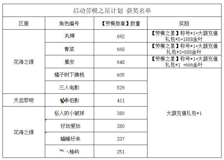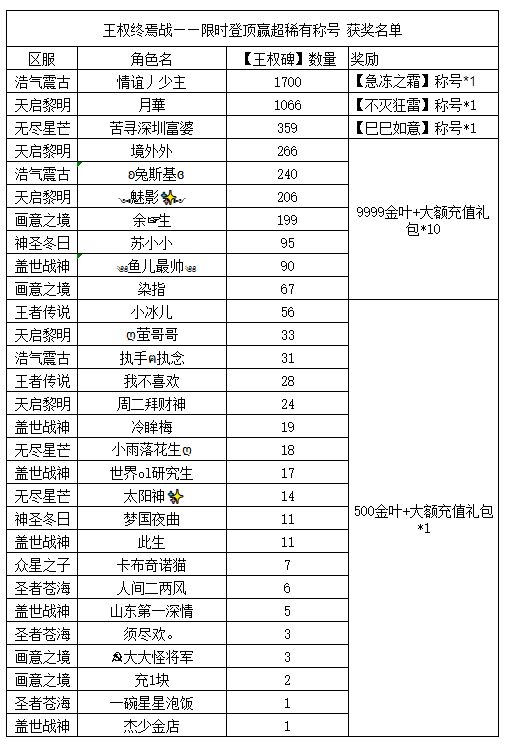 注:以上活动排名均以服务器时间为准。新区排行榜活动如发现存在违反游戏相关规定使用游戏外的辅助工具进行作弊将取消获奖资格。恭喜以上获奖玩家,奖励将于7个工作日内发放,如有疑问请及时联系客服~