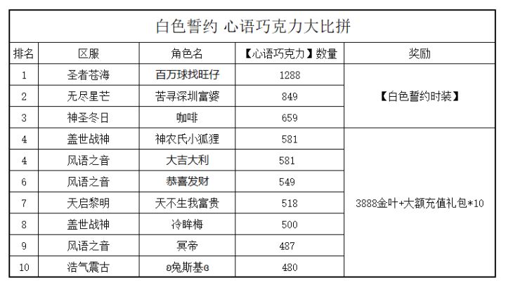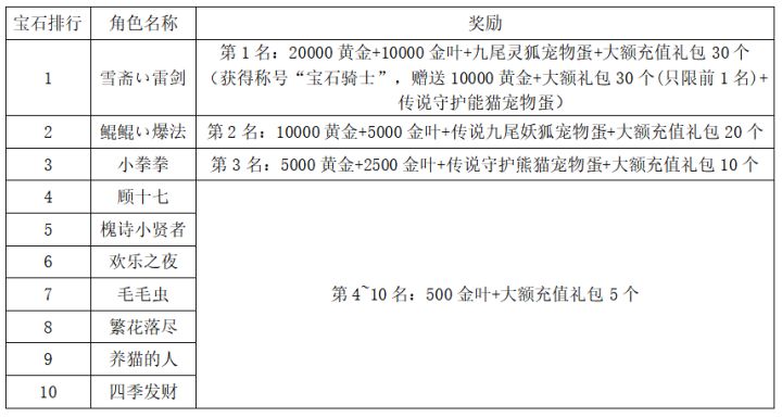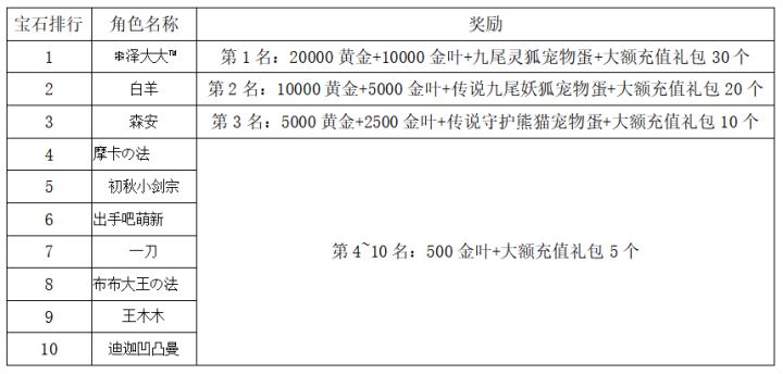注:以上活动排名均以服务器时间为准。新区排行榜活动如发现存在违反游戏相关规定使用游戏外的辅助工具进行作弊将取消获奖资格。恭喜以上获奖玩家,奖励将于7个工作日内发放,如有疑问请及时联系客服~