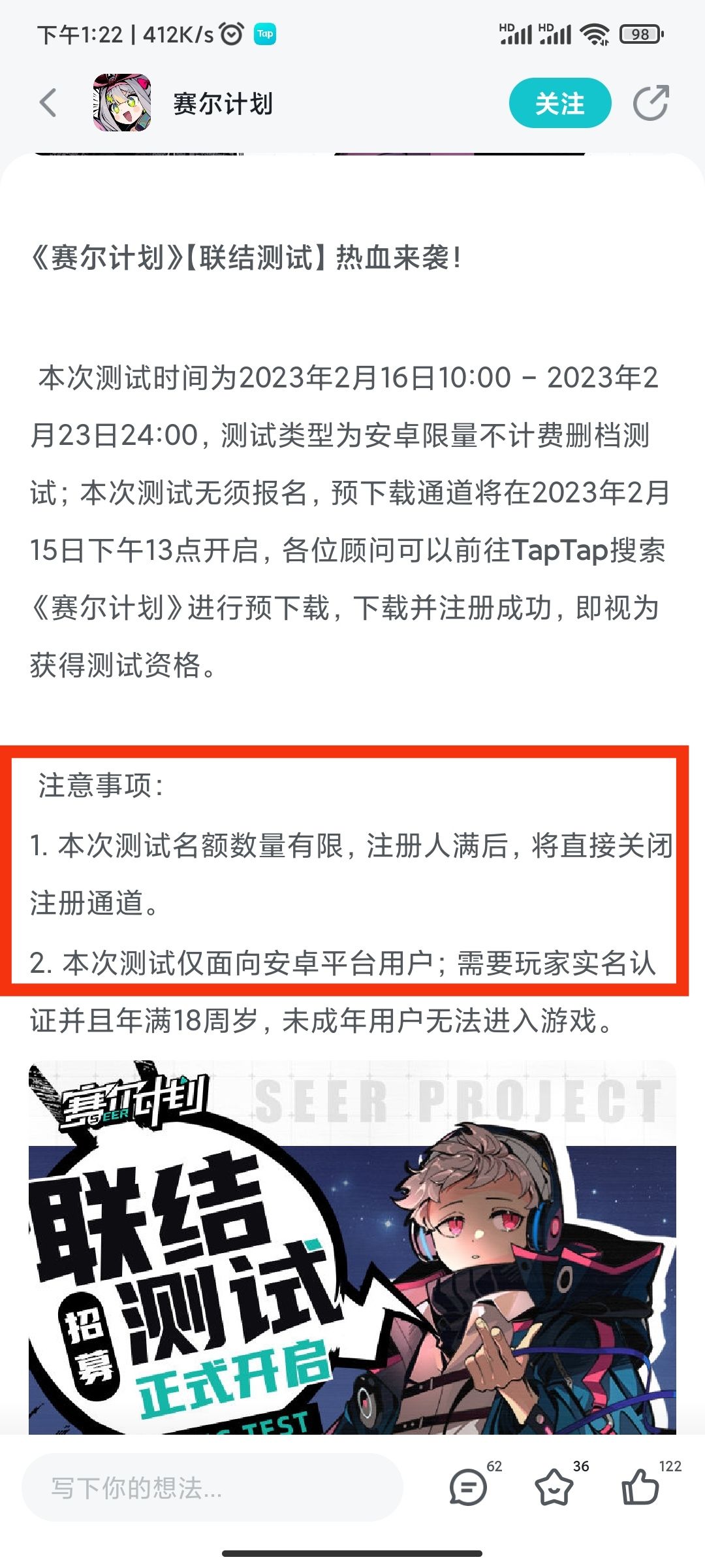 各位亲爱的顾问们: 本次《赛尔计划》联结测试已经开放下载,请顾问们前往taptap下载并注册游戏,以获取测试资格。 联结测试将于2月16日10:00开启,于2月23日 24:00结束,请顾问们密切关注官方动态,合理分配时间并体验游戏。 关于本次测试有任何疑问,可以前往社区搜索【联结测试FAQ】并查看更多测试细节。 ———————————————————————— ☆《赛尔计划》全平台预约已开启,前