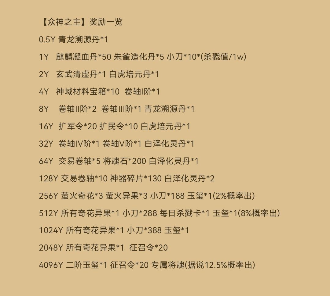 我不确定准不准,有可能有错误 【众神之主】奖励一览 0.5Y 青龙溯源丹*1 1Y 麒麟凝血丹*50 朱雀造化丹*5 小刀*10*(杀戮值/1w) 2Y 玄武清虚丹*1 白虎培元丹*1 4Y 神域材料宝箱*10 卷轴I阶*1 8Y 卷轴II阶*2 卷轴III阶*1 青龙溯源丹*1 16Y 扩军令*20 扩民令*10 白虎培元丹*1 32Y 卷轴IV阶*1 卷轴V阶*1 白泽化灵丹*1