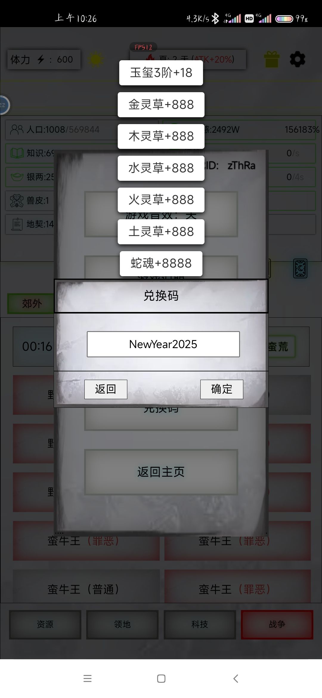 首先新春兑换码NewYear2025奖励如图 可喜可贺,起码作者知道萌新最缺草了 但是自从蛮荒炼丹版本出来后,整体数值爆炸,不同阶段不是一个游戏,这个兑换码对中期以后的人完全没用,某种程度上来说可以讲蛮荒后面毫无可玩性只是简单的数值堆叠 而且作者本人写崩蛮荒以后,直接摆烂了停止更新,新萌新面对一堆入门难不管不顾,老东西没新意陆续全跑,秘境深海更是遥遥无期 目前只推荐萌新借助蛮荒速通4096神主,这