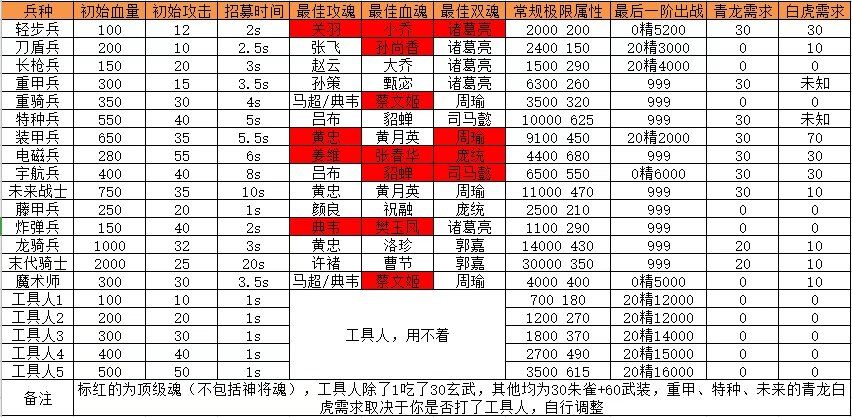 自从玩了这个游戏,杂七杂八的表弄了很多,就不分开了,直接都发在这里,有需要的可以拿去,后续也可能会补充 这个最初是想更新一下兵种的初始属性的,老表有几个都不对了,然后又加了将魂推荐和常规极限属性要求,算是个三合一表。 这个是量子武装的武装表和极限表,其他大佬已经有几个不同的版本了,不过有的也是老表,注意,这个推荐是按能低级果子就不高级果子的原则来的(15极限不是,15极限最低是20金8红),不想用