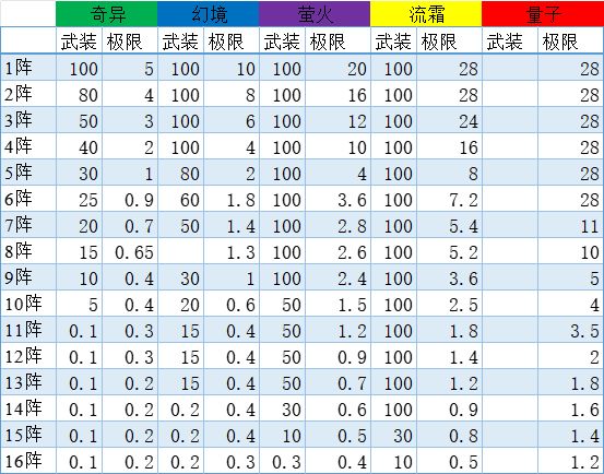 量子武装武装次数不限,每阵100%,极限每阵限28次,最多能提升128%。 下一阵100%数值为上一阵数值,为追求及时收益可自断前程提升属性,获取更多资源。 每种颜色果子武装极限加成,如图所示。另附16阵全极限属性#攻略#游戏讨论