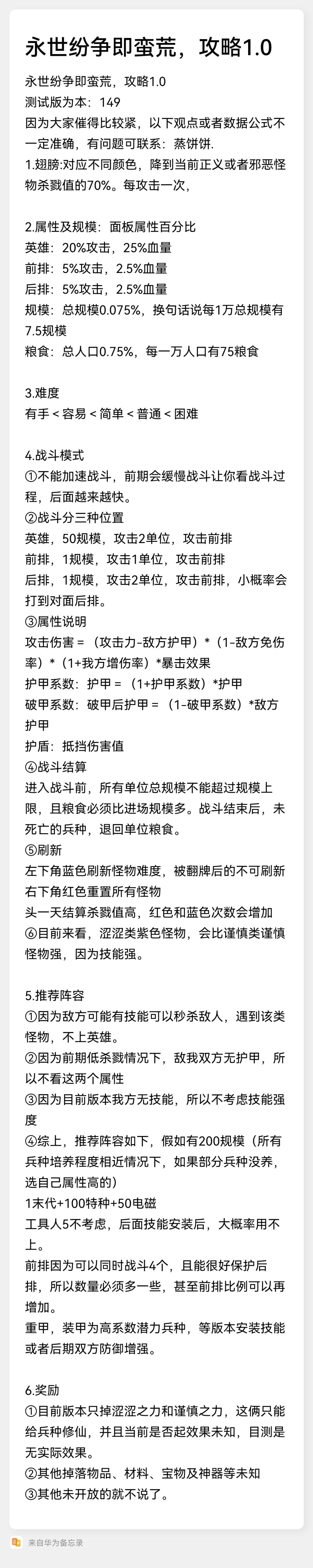 本文是蛮荒至今的攻略总结和打法思路。包括培养和战斗两方面 培养方面前期已经有很多攻略了,在这里附上链接,自行查询便可,本篇主要讲述测试后实用的打怪思路 功能介绍请跳转 炼丹攻略请跳转 本文依旧会介绍一些培养方面的内容,如果和上述链接冲突,以本文为准 本文还是延续1024的风格,先介绍机制,给希望自我探索的人信息支持,再划分阶段,给大家一个参考。 首先是机制方面: 1.在实际战斗中发现,敌人的一些非
