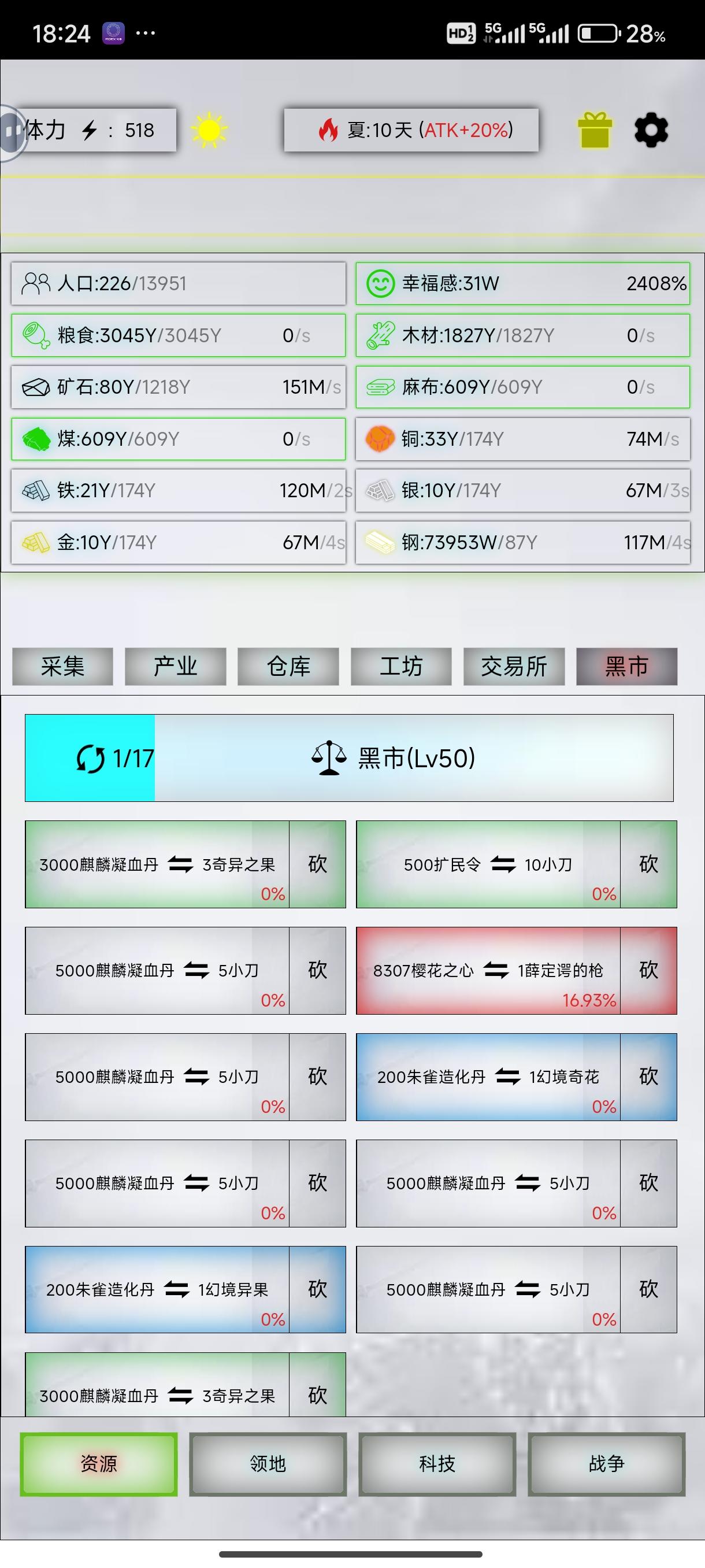 以为人口越多越好,就用了二十个,从8暴涨到48,结果发现基础设施太差,生产力太低,到冬天大把大把的死人,没招了,只能等春天,人都加到 木头上,下线挂机等资源,上线升级仓库,之前仓库甚至还不到 万 。
