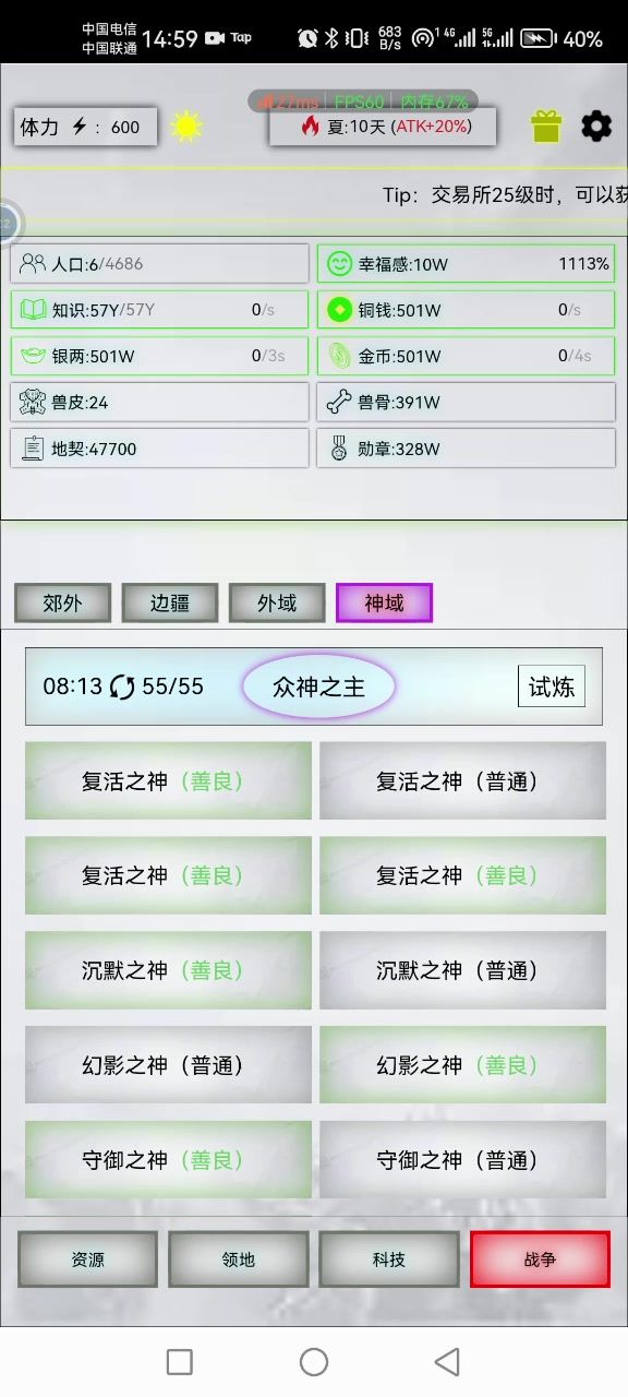最近玩了一款taptap上的游戏,叫放置时代,评分9.1,但没热度,很肝,上上周开始玩,看taptap上都是进入蒸汽时代再打神。我就想试试不进蒸汽时代可以弑神吗?事实证明轻步兵+龙骑兵也可以弑神。还蛮好玩的,就是平常摸鱼时玩一会儿,可以当挂机游戏玩。#新游安利局#攻略#游戏安利#游戏推荐#单机游戏#放置时代