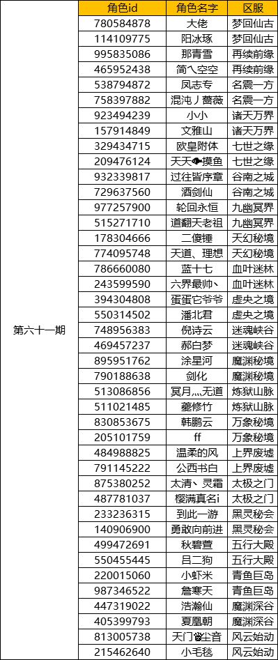 各位道友好:感谢大家对“七孔灵宝”抽奖活动的积极参与!上周(6月28日0:01~7月4日23:59)的七孔获奖名单公布如下:获奖者信息:奖品为:【7孔随机袋1个+稀有金袋子4个】(1个稀有金色 福袋可以开出5个稀有金色法宝残片)奖品将于近期发放,请中奖者留意邮件~本周的抽奖活动已正式开始,请各位准时参与!本周抽奖活动时间:7月5日0:01~7月11日23:59参与方式:关注微