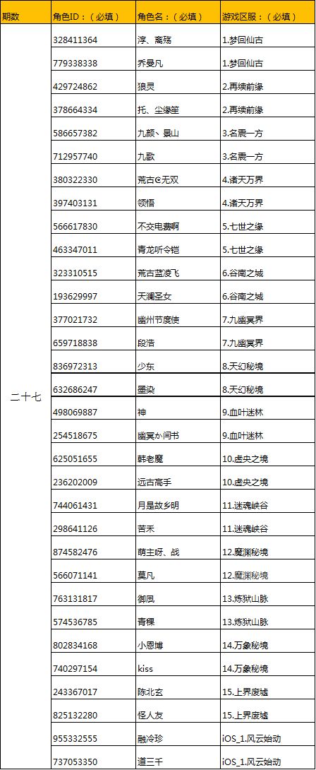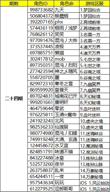 各位道友好:感谢大家对“七孔灵宝”抽奖活动的积极参与!上周(10月19日0:01~ 10月25日23:59)的七孔获奖名单公布如下:奖品为:【7孔随机袋1个+稀有金袋子4个】(1个稀有金色 福袋可以开出5个稀有金色法宝残片)奖品将于近期发放,请中奖者留意邮件~本周的抽奖活动已正式开始,请各位准时参与!本周抽奖活动时间:10月26日0:01~ 11月1日23:59参与方式:关注微