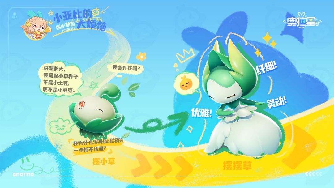 大家早上好呀! 今天要跟大家揭秘的是... Q弹小种子——摆小草! 梦想成为舞者却因为圆滚滚的身型而深陷烦恼 憧憬族群里的摆摆草大前辈的舞动的优美身姿 早早不负有心草! 今天多浇一杯水助力摆小草的长大梦想!