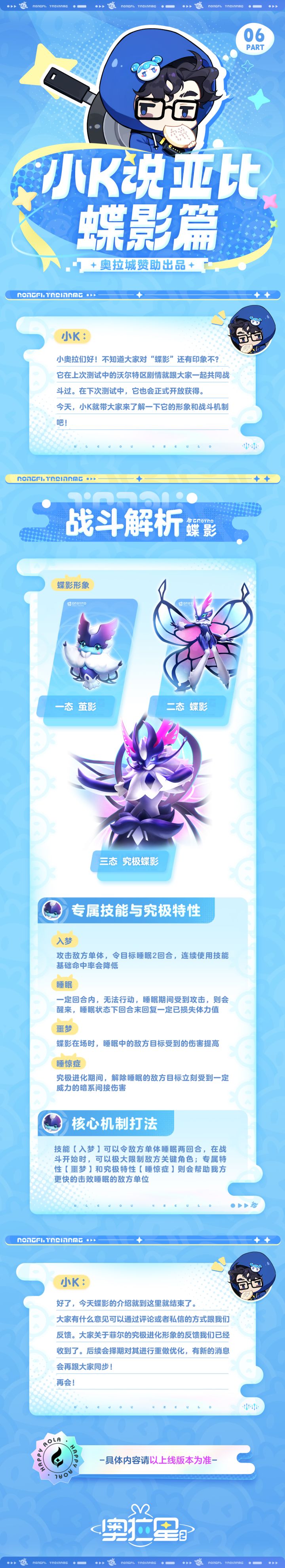小奥拉们好,我是小K今天带大家了解的是亚比-蝶影的形象和战斗机制在下次测试中蝶影也会开放获得,与小奥拉一同战斗同时,关于菲尔的究极形象的反馈我们已经收到后续也会对其进行重做优化,敬请期待!#奥拉星2#游戏推荐